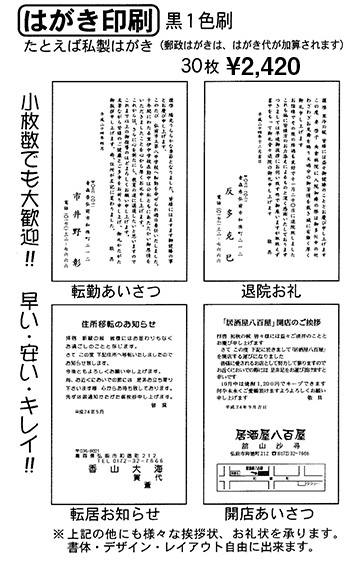 | 【印刷】名刺、ハガキ、封筒、案内状、伝票、チラシ等の印刷・賞状揮毫 |