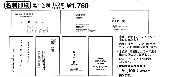 | 名刺印刷(標準タイプ) 100枚 黒一色刷り 1,760円 |